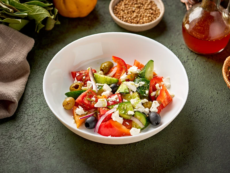 Самый популярный средеземноморский салат с хрустящими овощами, сыром фета , оливками и заправкой из зеленых трав